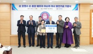 Nurturing Students' Aspirations on a Green CampusJeonbuk National University (JBNU)'s 12th president, the late President Jang Myung-su, who laid the foundation for the university's development, is being honored as his spouse, Mrs. Lee Soon-rye, donated a development fund of 10 million won in keeping with his educational philosophy.